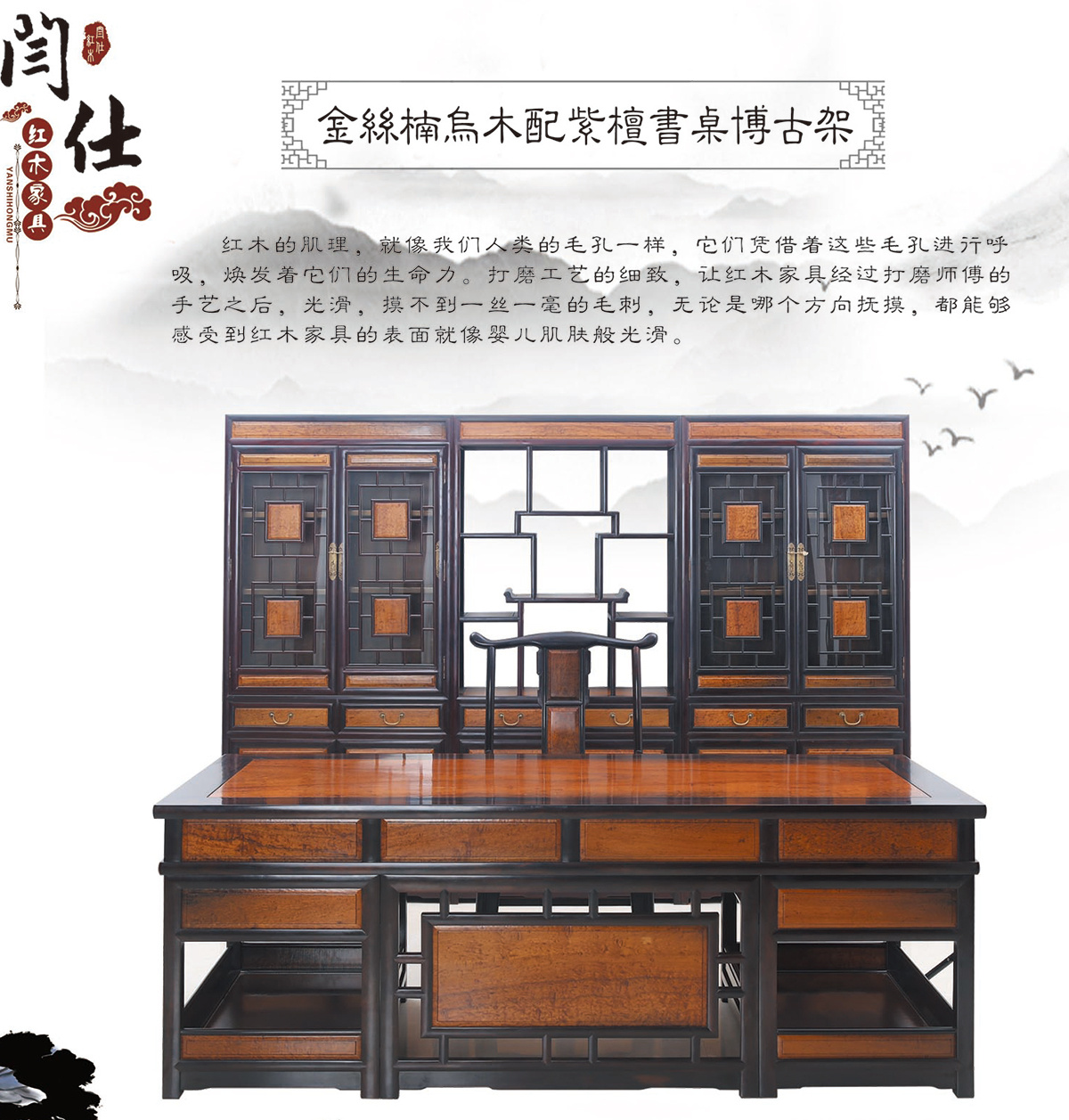 金林楠鳥木配紫檀書桌博古架